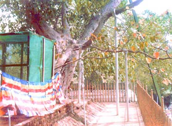 The photo shows the plant. But is now protected with a mesh. The plants seen around it are off-shoots of the original plant. This plant is considered to be the oldest documented (the day it was brought to Sri Lanka and its subsequent events are all recorded in historical documents) tree in the whole world. In about the 1970's a gold plated fence was erected around this tree. The railing is seen on the right side. |